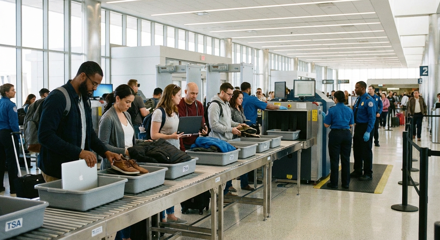 *승객들이 보안검색대에서 바구니에 짐을 넣고 엑스레이 검사를 기다리는 모습*